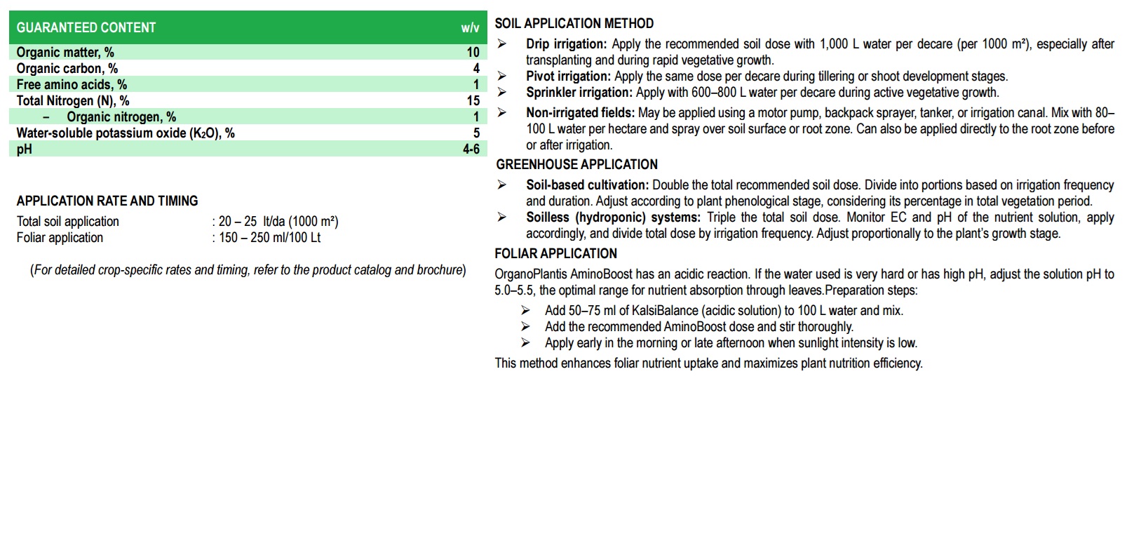 OrganoPlantis AminoBoost is a liquid organic fertilizer containing plant-based free amino acids, organic matter, nitrogen (N), and potassium (K). It stimulates intracellular enzyme activity, enhances photosynthesis, facilitates nutrient uptake, and accelerates plant metabolism. When applied before stress conditions, it provides a protective effect; when applied after stress, it aids recovery. Regular use improves plant growth performance and overall productivity.