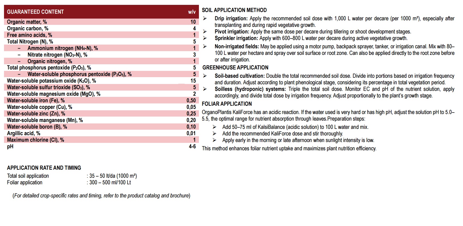 OrganoPlantis KaliForce is a liquid organomineral fertilizer developed to improve quality parameters such as fruit growth, color development, flavor balance, and shelf life. In addition to its high potassium (K) content, it contains nitrogen (N), phosphorus (P), microelements (Fe, Zn, Cu, Mn, B), free amino acids, and argillic acid. This special formulation enhances fruit size and firmness while increasing plant tolerance under stress conditions (temperature fluctuations, salinity, drought). Regular application ensures high productivity and marketable produce with superior quality.