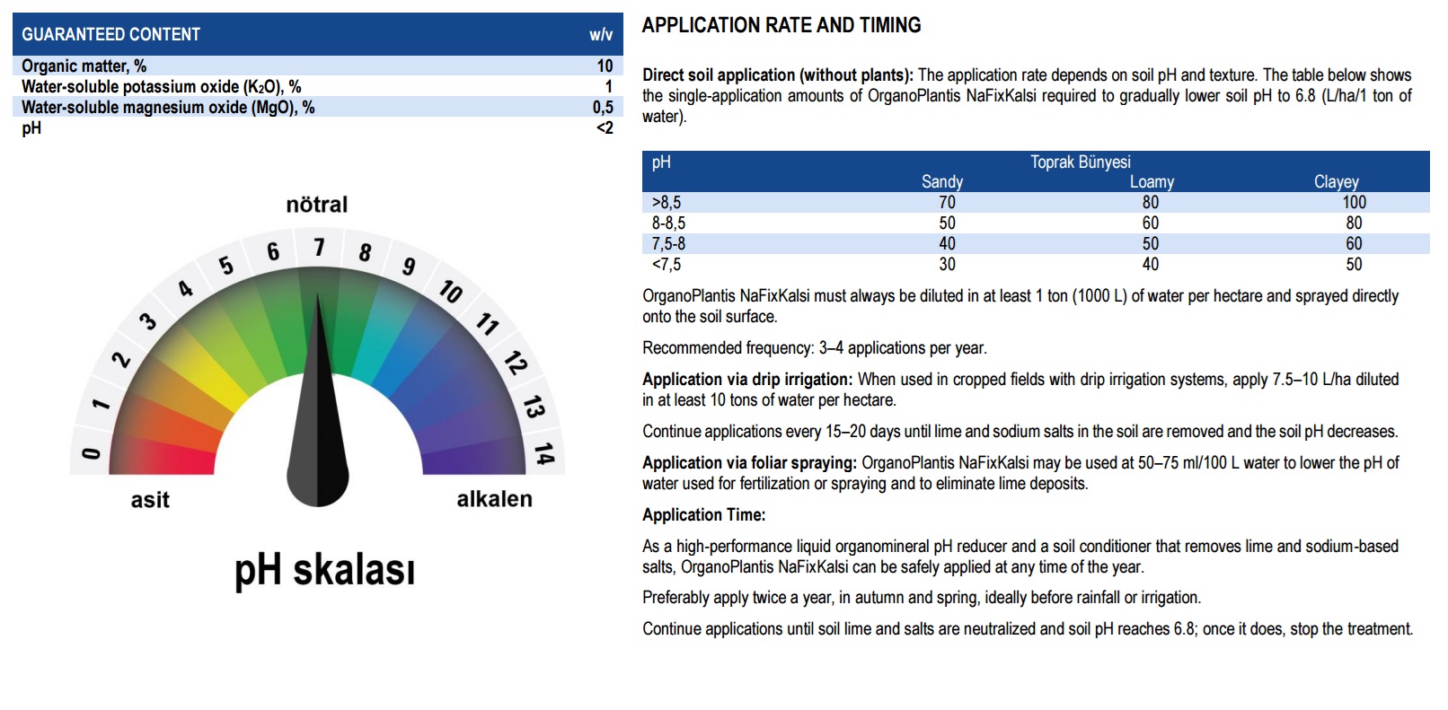 OrganoPlantis NaFixKalsi is a highly effective organomineral pH reducer–lime and salt remover (pH<2) developed to eliminate the adverse effects of lime and sodium-induced salinity in alkaline soils. Its organic matter and inorganic components neutralize soil alkalinity, enabling plants to absorb nutrients more efficiently. By promoting the ion exchange of Na with K and Mg, it converts sodium into a leachable form, thus removing it from the soil. This process enhances soil fertility, supports plant growth, and contributes to yield improvement.