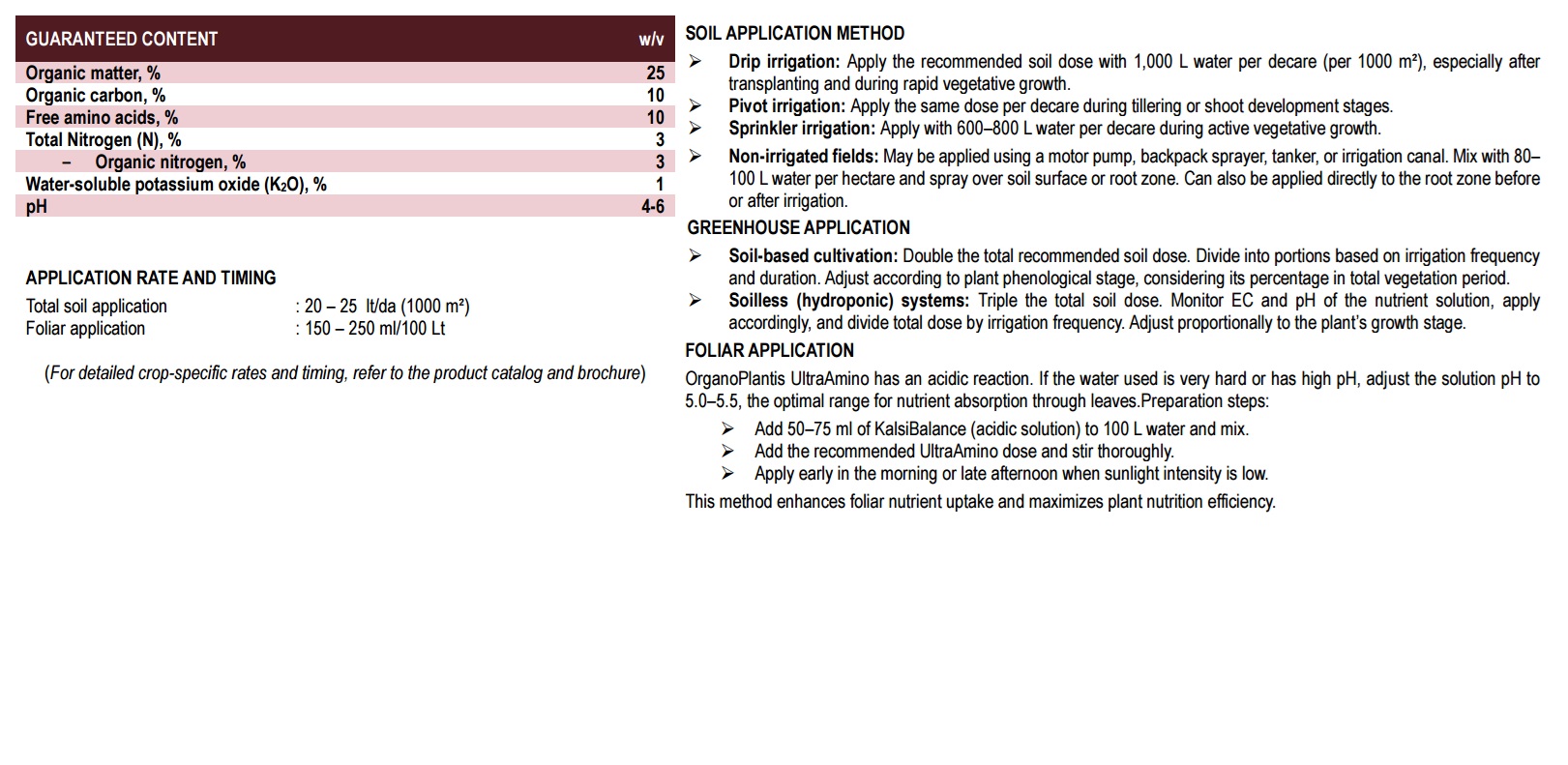 OrganoPlantis UltraAmino is a powerful liquid organic fertilizer containing a high concentration of plant-based free amino acids, organic nitrogen (N), and potassium (K). It directly supports protein synthesis, hormone production, and energy metabolism in plants. When applied under stress conditions (drought, high temperature, salinity, etc.), it promotes rapid plant recovery and minimizes growth losses. Regular use enhances both yield and product quality.